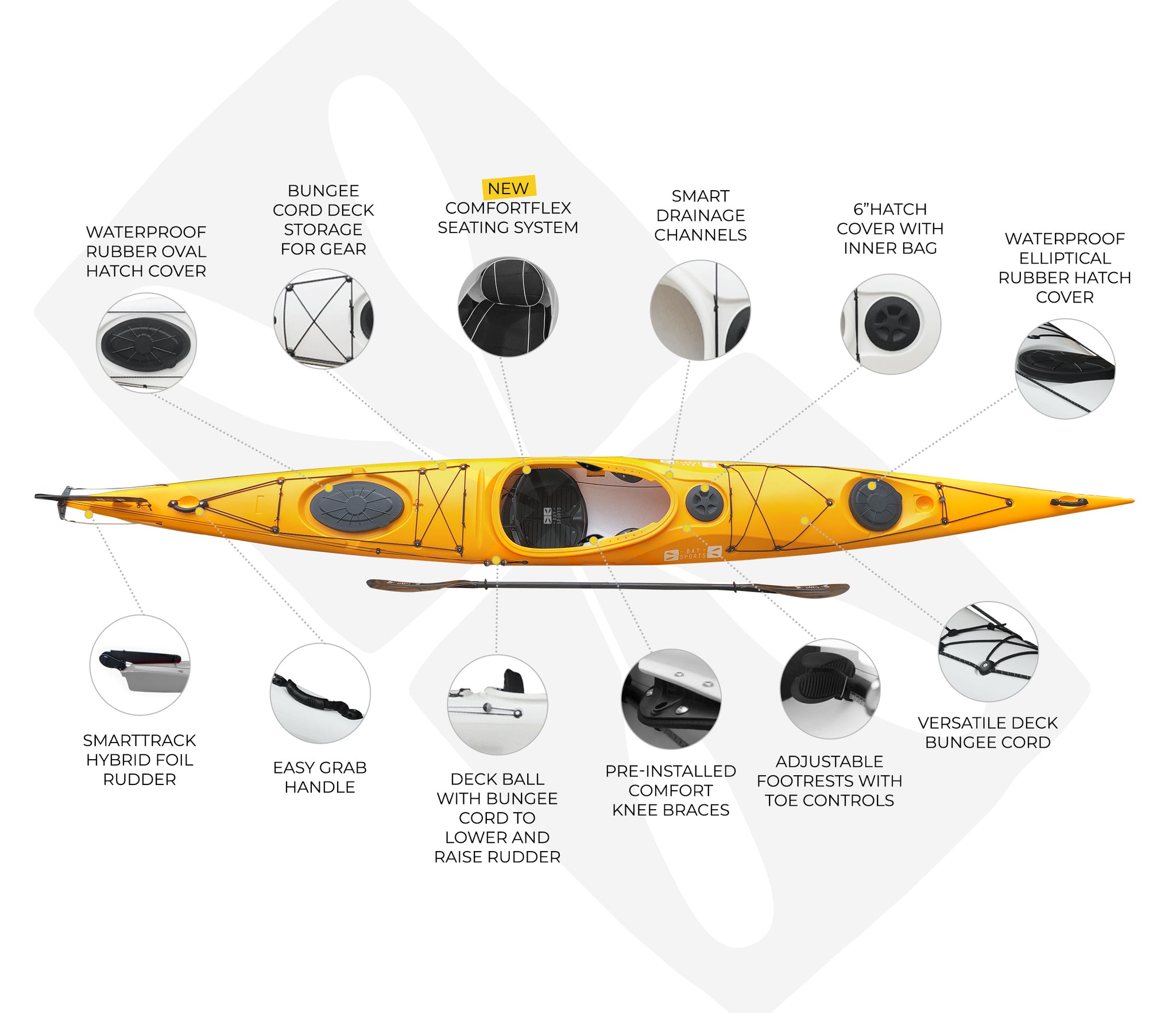 - Best Kayak Features: Longer design for speed, V-shaped hull for cutting through waves, rudder system for steering, and extra safety features.